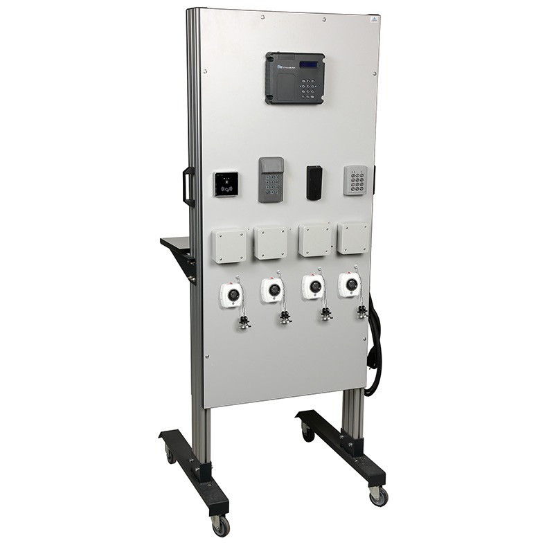 This system allows you to explore the various technologies of building access control by simulating the opening of doors. The control panel communicates with four control stations via an RS485 bus, which, based on a code, a Mifare badge, or a QR code, authorizes access after consulting its database.