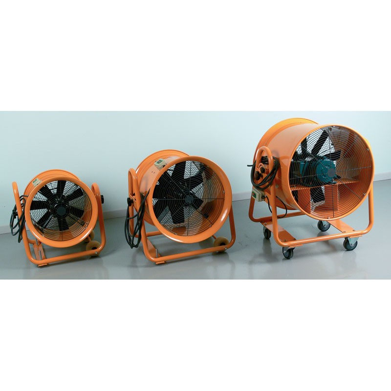 These fans, mounted on a wheeled chassis for easy movement, rotate around a horizontal axis so that the airflow can be pointed in any direction. These fans make up ideal three-phase loads for connection to a control requiring inductor currents to study.